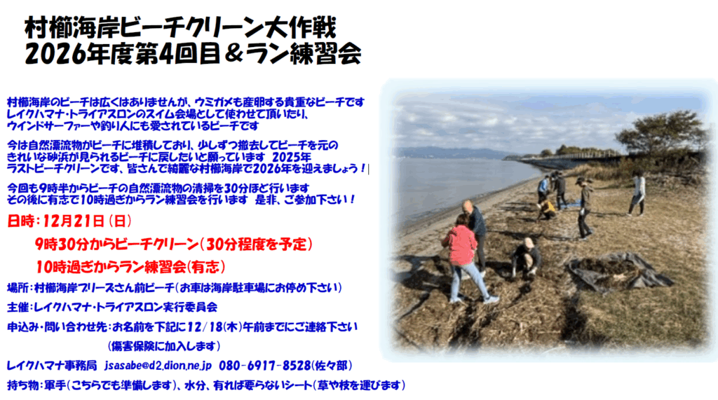 2025-12-07 / 最終更新日時 : 2025-12-07 レイクハマナ・トライアスロン事務局 2026 ビーチクリーン第4回目&ラン練習会のお知らせ 2025年ラストビーチクリーンです、皆さんで綺麗な村櫛海岸にして2026年を迎えましょう! 日時:12月21日(日) 9時30分からビーチクリーン(30分程度を予定) 10時からラン練習会(有志)場所:村櫛海岸ブリーズさん前ビーチ(お車は海岸駐車場にお停め下さい) 主催:レイクハマナ・トライアスロン実行委員会 連絡先等、詳細は下記のリーフレットをご覧下さい Follow me! FacebookXBlueskyCopy
